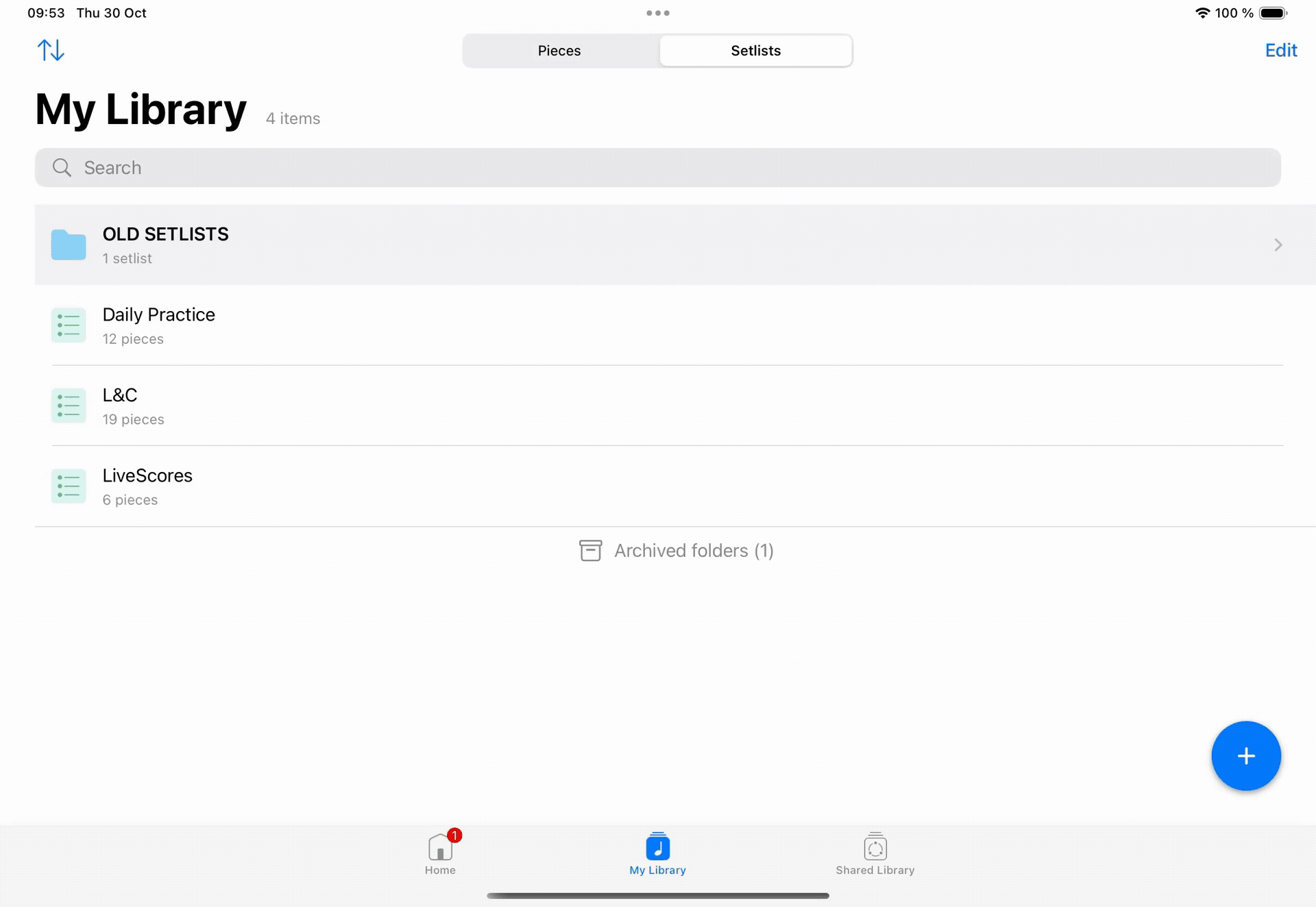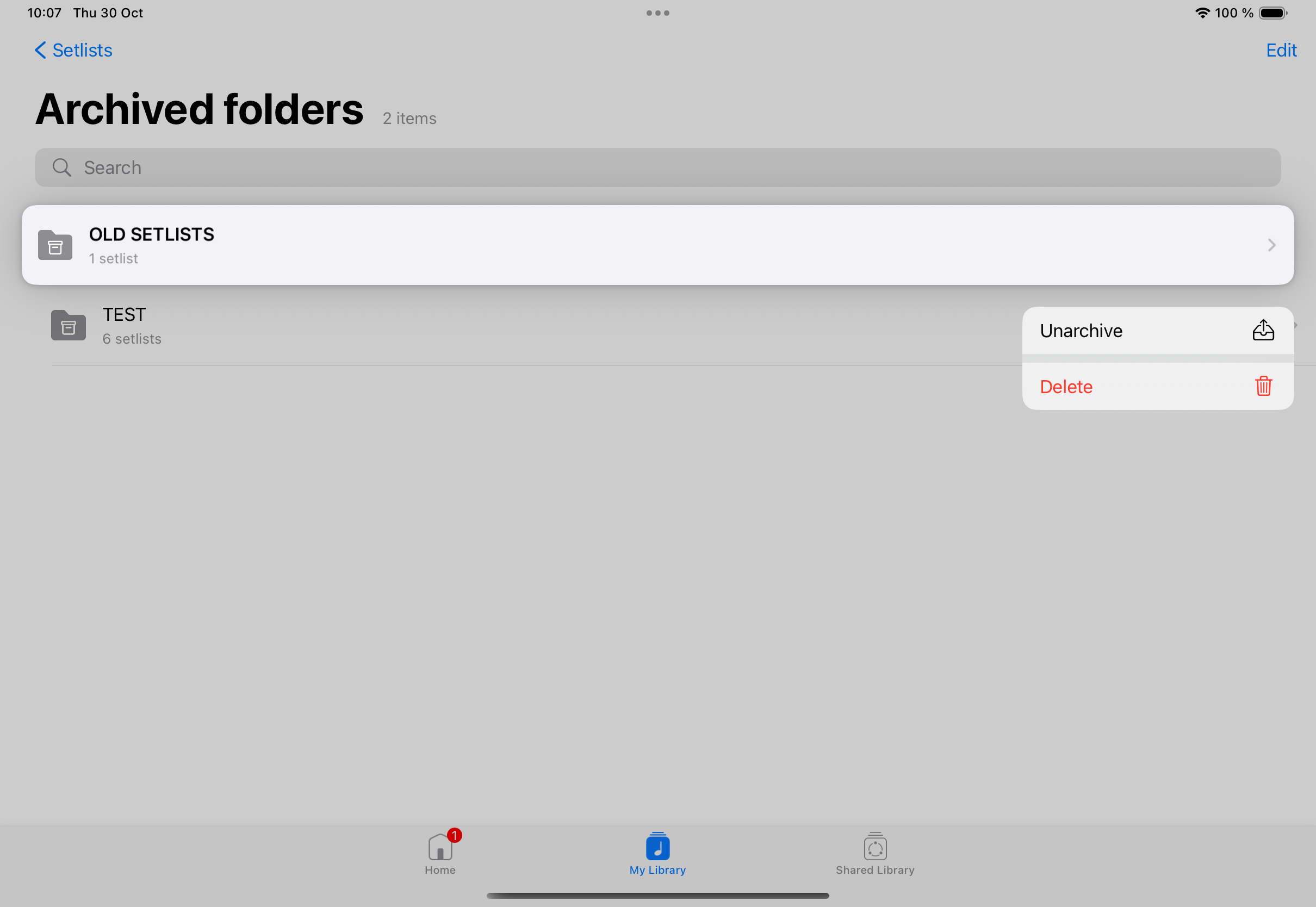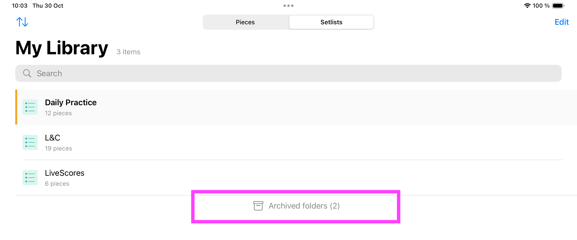 The archive folders are then stored in a separate section, accessible by tapping at the bottom of the Setlists list: