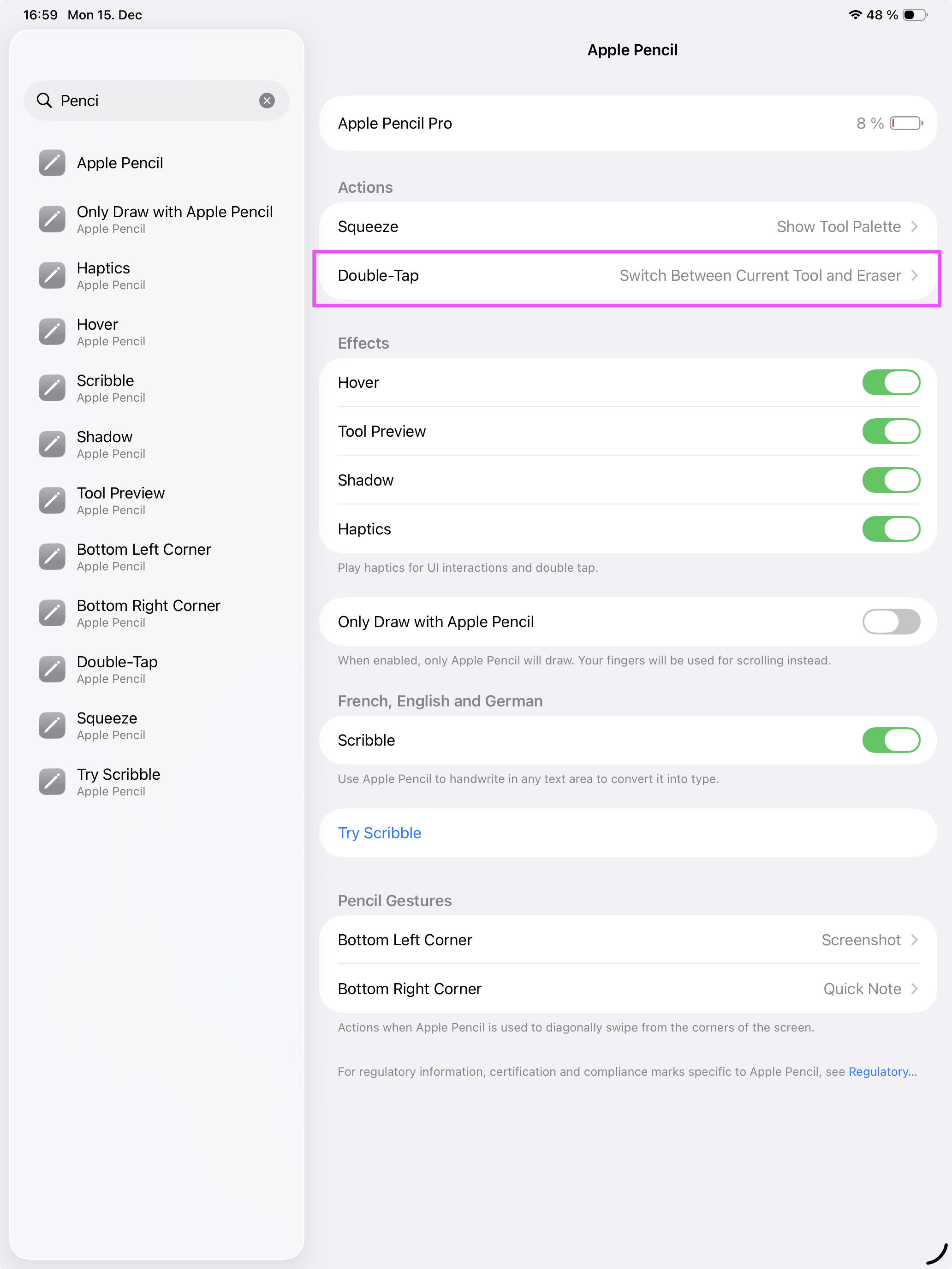 Pour désactiver la fonction "Toucher 2 fois", rendez-vous dans l'application réglages de votre appareil, dans "Apple Pencil", et désactivez "Toucher 2 fois".